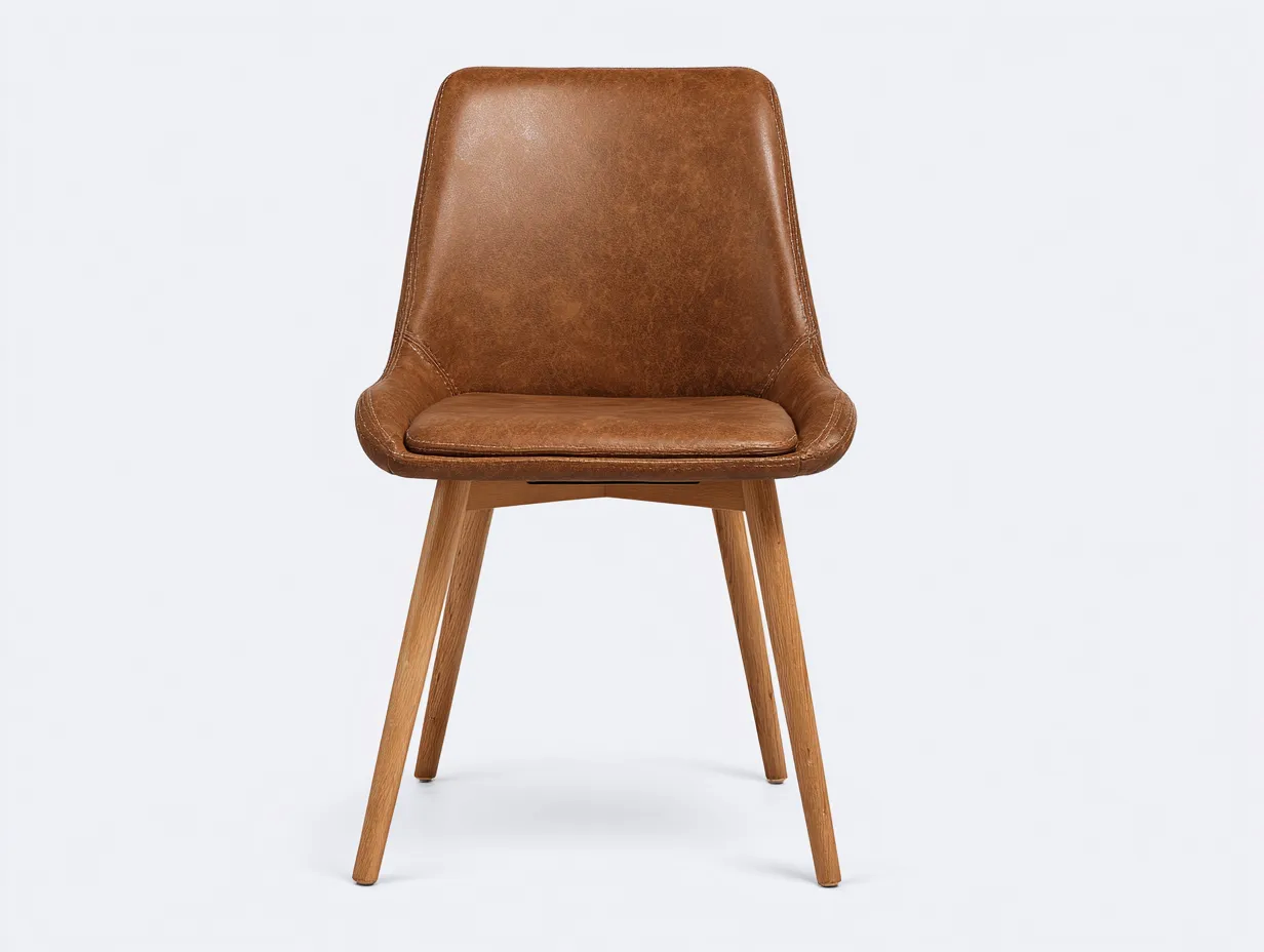 L'assise et le dossier sont habillés de similicuir marron. La structure repose sur des pieds en bois, offrant une stabilité fiable et une esthétique harmonieuse.