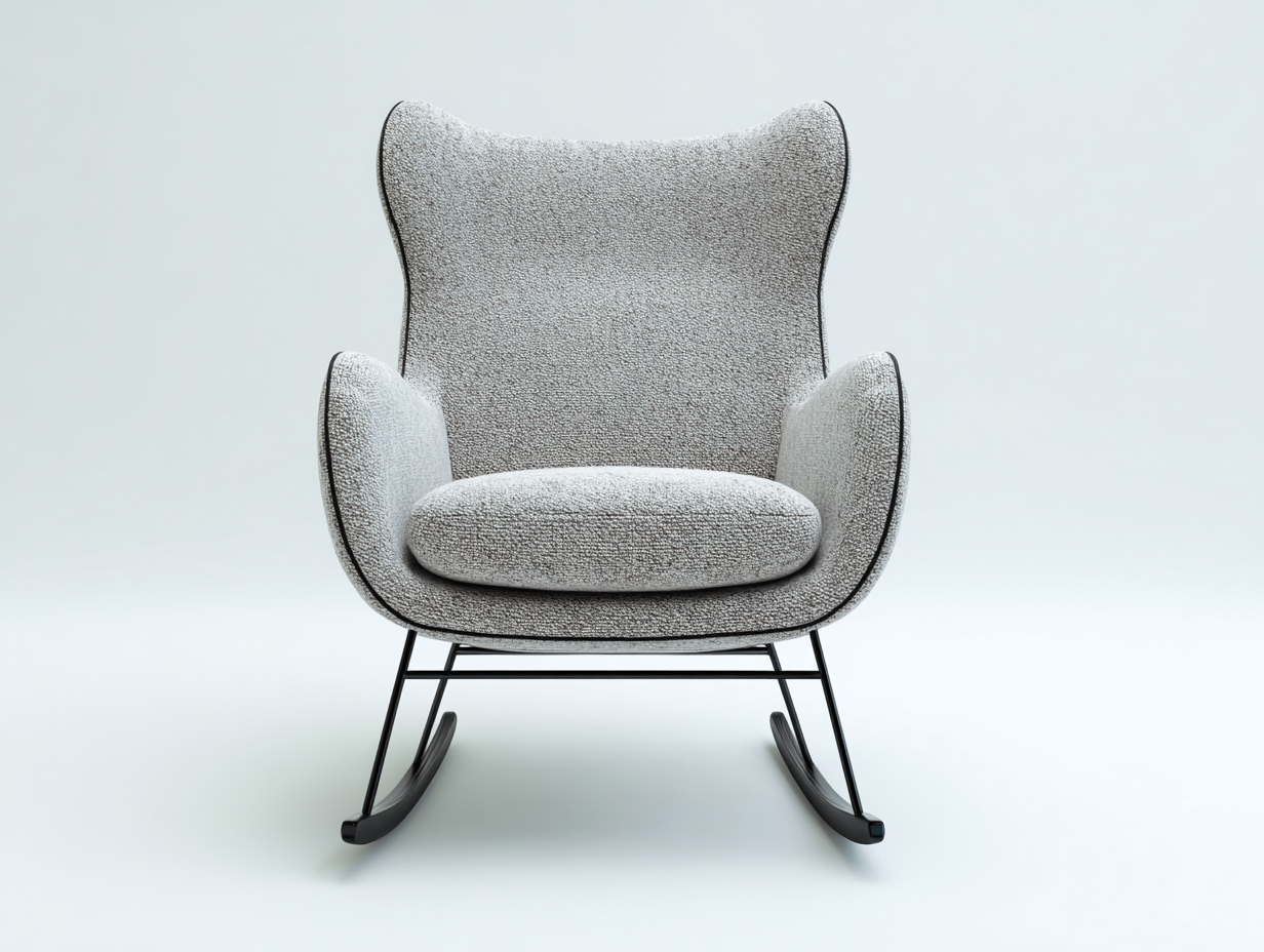 Le fauteuil est conçu avec un revêtement textile associé à une structure interne robuste. Le piètement en métal assure une base stable et un mouvement de bascule fluide, adapté à un usage domestique régulier.